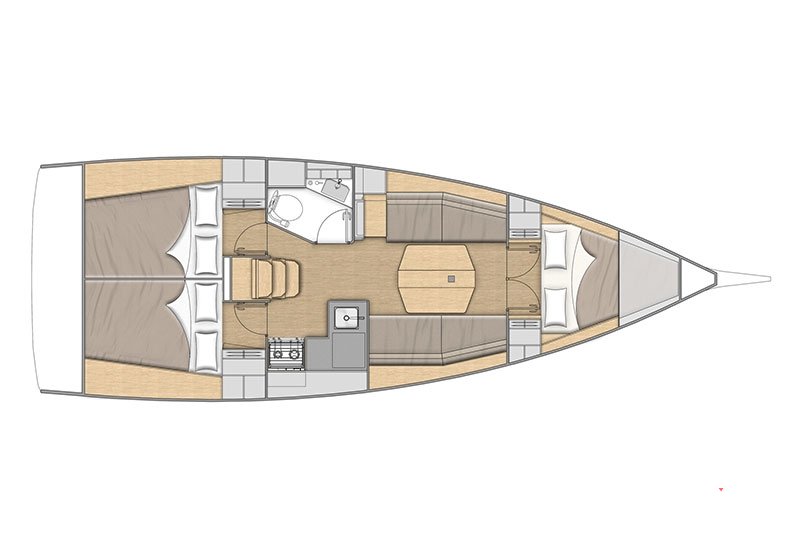 Les designers de Nauta ont créé un intérieur très moderne, décliné en noyer ou chêne flotté. Les panneaux de pont et les multiples hublots de coque et de roof diffusent une belle lumière naturelle et assurent une excellente ventilation. Dans le carré l’ingénieuse table à cartes avec plateau rabattable permet de disposer de deux couchages simples supplémentaires.